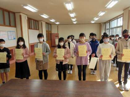 各種大会やコンクールで好成績をあげた子供に加え、委員会活動にこつこつ取り組んだり、毎朝の清掃ボランティアを続けたり、あいさつを地域に広げたりした子供たち8名に河上賞を贈りました。