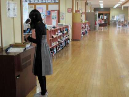 テストでしょうか? 廊下でリコーダーの練習。