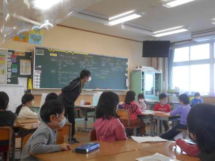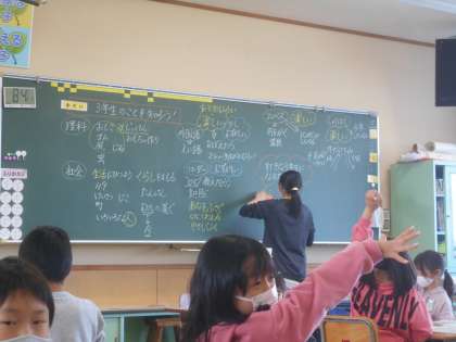 生活科の学習です。3年生に向けてみんなで話は合っています。子供たちの話を担任の先生が耳を傾けて聴き、黒板に整理して書きます。3年生のことがよく分かりますね。