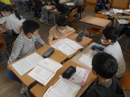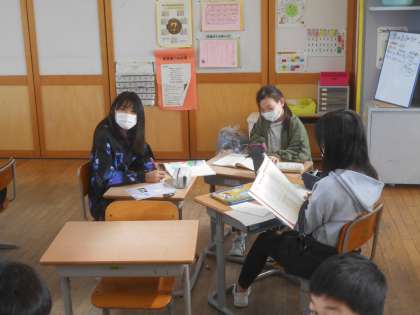 国語科の学習の感想交流の様子です。この学習を通して自分が感じたことを言葉で表現し、交流しながら学びを確かめていきます。