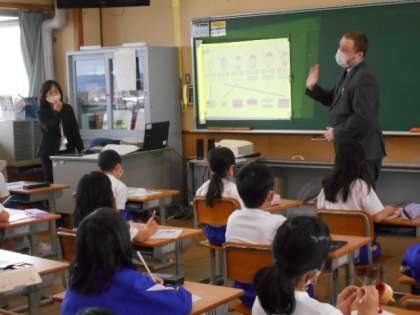 新しい先生をお迎えして外国語活動の学習が始まりました