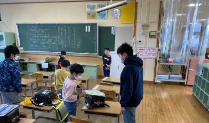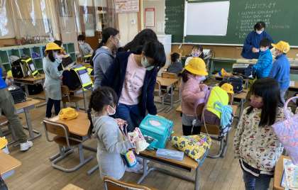 入学して間もない1年生が学校生活に早く慣れるように、登校後1年生教室で朝の準備のお世話をしています。自分に何ができるか考えながら行動する6年生です。