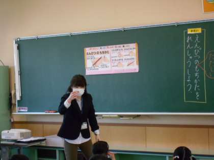 背筋はピン!話を聞くとき文字を書くとき、姿勢が大切です。また、美しい文字を書くときは鉛筆を正しく持つことが重要。しっかりと指導しています。