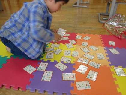 ひらがなをしっかり覚えるために、ひらがなカルタをしています。