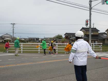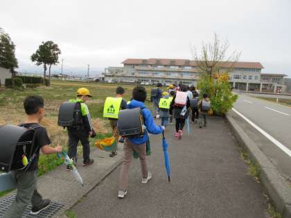 小さな一年生は、体ごと飛ばされそうです。地域の方が、しっかりと見守ってくださる中、上級生が集団登校の前と後ろについて、ゆっくりと歩いていました。黄色い帽子が飛ばされそうで、手に持って登校しました。