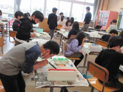 「自分の心」の色を表現しています。ストローで吹いたり、筆先にいろをつけてしぶきを飛ばしたり、工夫しています。