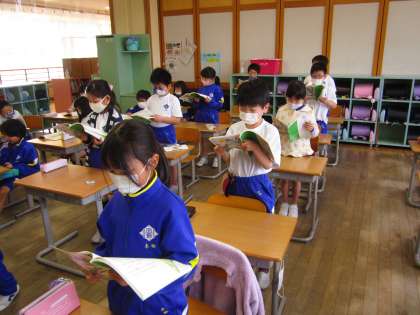 役に分かれて音読しています。声の大きさや動きを工夫しながら楽しく音読しています。