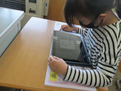 漢字ドリルについているQRコードを読み取って、書き順の確認をしています。タブレットの操作もだんだんと上手くなってきました。