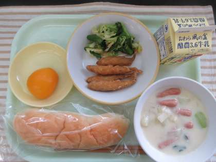 今日の献立は、米粉コッペパン、わかさぎのフリッター、グリーンサラダ、クリーム煮、桃缶、牛乳です。