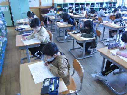 今日は、学力調査の練習問題に取り組みました。子供たちは集中して問題を解き、テストを受けるときのきまりを守る練習をすることもできました。