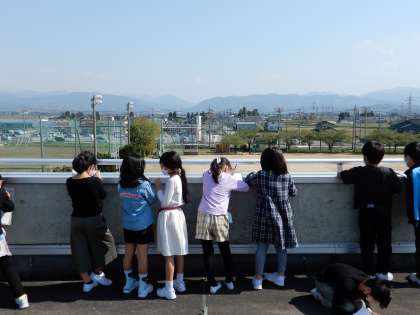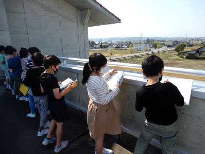 地図を用いて宮野校区の様子について考えてきた子供たち。今日は、屋上からそれぞれの方角を見て、見えるものをノートに記録しました。