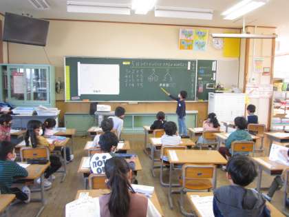 1組では、算数の学習で、5はいくつといくつの学習をしました。子供たちで、2と3で5になることや、1と4で5になることを説明しました。