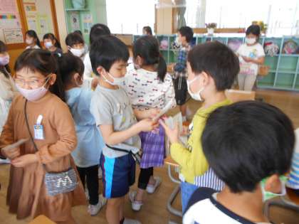 2組では、国語科「どうぞ よろしく」の学習で、カード(名刺)を交換しました。また、お話ししたことのないお友達の名前を知ることができました。