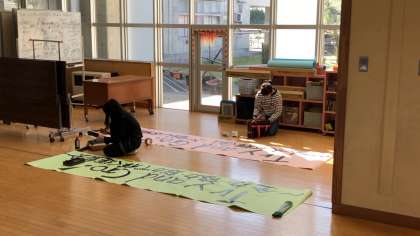 児童総会や結団式に向けて、児童会スローガンや運動会スローガンを一生懸命書いていました。