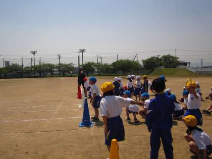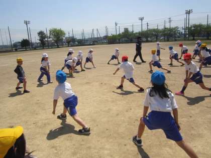 体育では、子供たちが前に出て準備運動を頑張っています。今日は、色団対抗リレーを行いました。1、2組の同じ色団の友達と協力し、一生懸命走ったり応援したりしました。