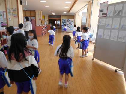 生活科の学習で、学校の中を探検しています。先日は、クラスのみんなで探検しましたが、今度は一人一人で探検をし、見つけた物をカードに書いています。そして、自分が見つけた物を教え合っています。