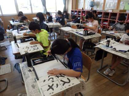 最初に、姿勢や筆の持ち方などを改めて確認し、今日は「ふるさと」という文字を練習しました。点画のつながりを意識しながら書くことができました。