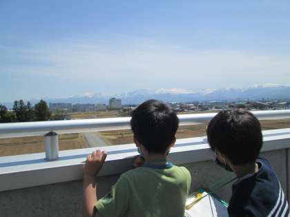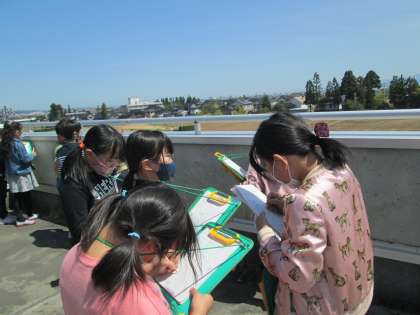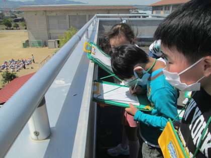 社会科の学習の様子です。高いところから学校の北側、南側、西側、東側の様子を調べました。方位によって建物の様子や土地の様子が違うことを発見していました。