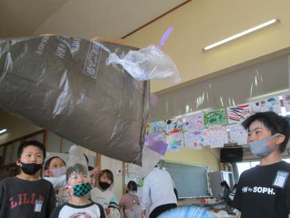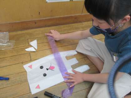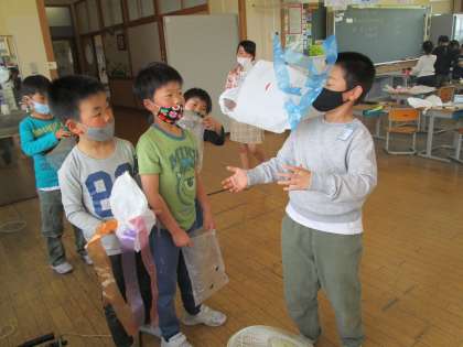 ふくろを風にのせてとばしました。ふくろも飛ばすとおもしろいと思うものを絵に描いたり、飾りをつけたりして作りました。