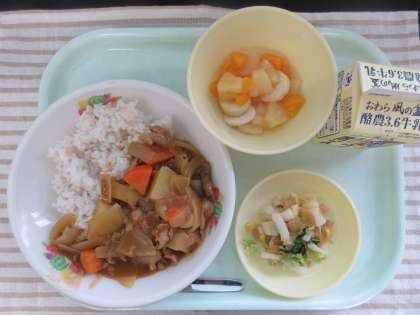 今日の献立は麦ごはん、カレーライス、福神和え、フルーツポンチ、牛乳です。