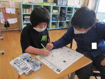 上学年のお兄さんが、下学年の学習を見てくれました。「ぼくが、みましょうか。」という一言がとても頼もしかったです。宮野っ子検定、みんなで頑張ったので、外で遊びました。ゴールデンウイーク安全に過ごし、また元気な姿を見せてください。
