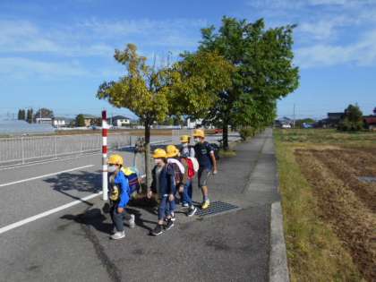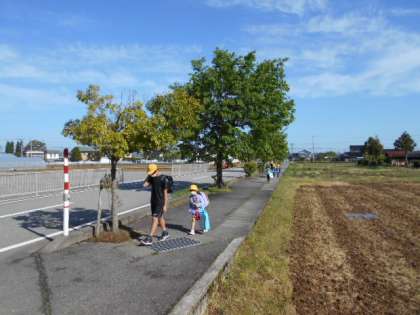連休が終わり、今日から学校が再開です。気持ちのよい天気に恵まれました。さっそく上級生が下級生のお世話をしながら集団登校です。
