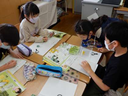 あおむしの観察をしました。虫眼鏡でよく見てノートにまとめていました。キャベツを食べたり、糞を出したりしている様子に大興奮の子供たちでした。