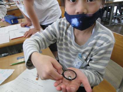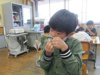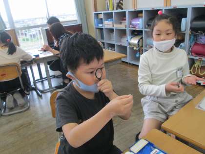 植物の成長を見る学習に入っています。今日は虫眼鏡を使って、種の色、形、大きさをじっくり観察しました。