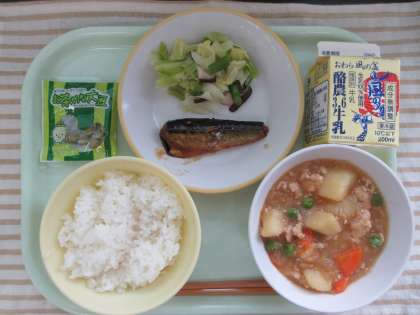 今日の献立は、ごはん、いわしのしょうが味、野菜ソテー、じゃがいものそぼろ煮、まっちゃ大豆、牛乳です。