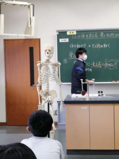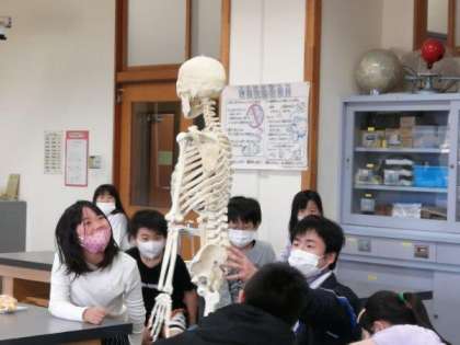 「人の体が動くのはどうしてだろう?」理科室で「ほね太郎」くんが登場しました。自分たちの体は、たくさんの骨や筋肉でできていることに驚いている子供たちでした。わくわく感や驚きが、学習意欲を高めます。これからも、子供たちが「なぜだろう?」「そうだったんだ!」と思考と発見いっぱいの授業を目指します。