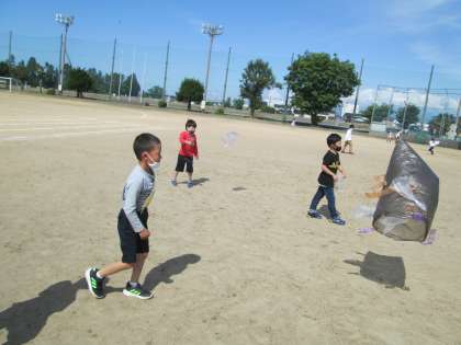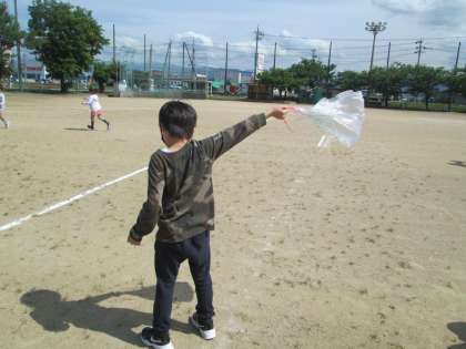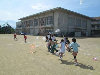 図画工作科の学習で、風にのるふくろを想像していろいろな形にしてみたり、色をつけてみたりしたふくろを飛ばしました。今日は風がある日だったので、外に出てふくろを飛ばしてみました。子供たちは、ふわふわと飛んでいくふくろにおもしろさを見つけていました。