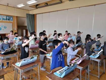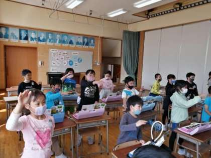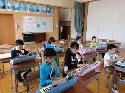 「ドレミで歌おう」の曲を、歌ったり、鍵盤ハーモニカで演奏したりしました。体で音の高さを表現したり、階名唱をしたりして、音の高さを感じ取る活動を楽しみました。