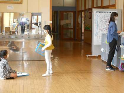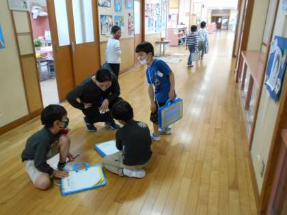 学校にいらっしゃる先生はどんなことをしているのかを中心に探検しました。たくさんの先生がお仕事しているのをカードに書きました。