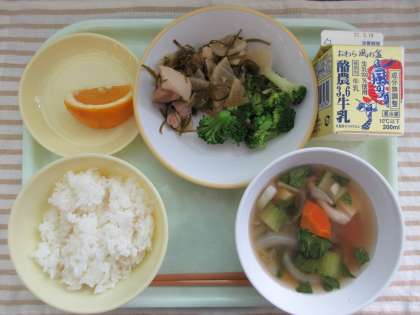 今日の献立は、ごはん、豚肉と昆布の甘辛煮、ゆでブロッコリー、中華スープ、甘夏みかん、牛乳です。