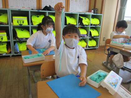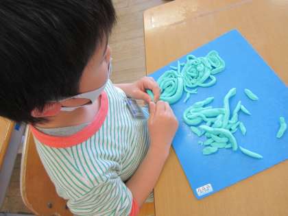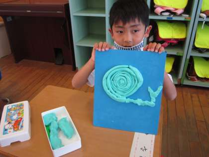 図画工作の学習では、粘土を使って造形あそびをしました。「すべすべしているよ」「結構固いね」「指で押したら、指の跡がついたよ」と感触をたのしみながら、長いひもを作ったり、ひもから思いつくものを作ってみたりしました。
