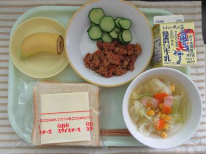 今日の献立は、食パン、チリコンカン、きゅうりもみ、キャベツスープ、スライスチーズ、バナナ、牛乳です。