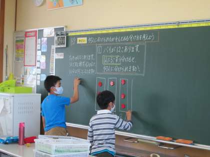おはじきを使って、割り算の学習中です。実際に手を動かしながら考えることで、理解力が深まります。