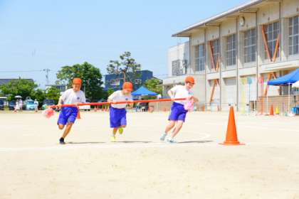 運動会で、4年生は団体競技として「台風の目」と「リレー」を行いました。