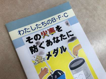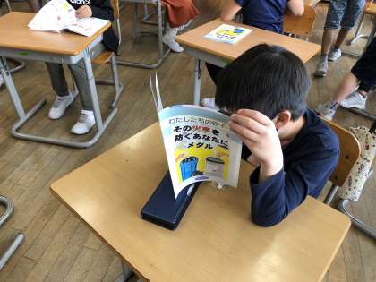 教室に戻り、小冊子を読んだり、バッジを安全帽子に付けたりしました。これから、少年消防クラブの団員として、防災について考え、実践していきます。