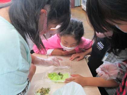 理科でチョウの観察をするために、青虫を育てています。ケースの中を掃除したり、キャベツの葉を新しいものに入れ替えたりして、青虫をみんなで大切に育てています。