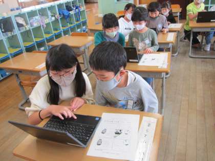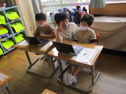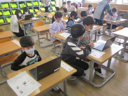 初めてクロムブックを使ってみました。6年生に教えてもらいながら、アンケートに答えました。上手に操作をしていました。