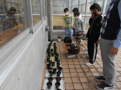 登校した子供たちが担任と一緒に観察しています。