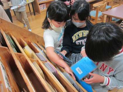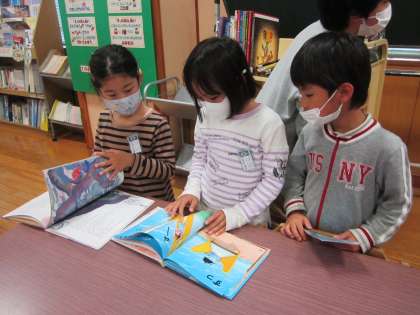 休み時間には、仲良くなった友達と教室で遊んだり図書室で本を借りたりしています。図書室の利用の仕方にも慣れ、たくさん本を借りています。