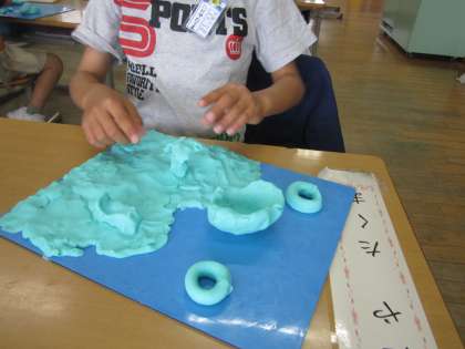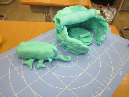 図画工作科の学習では、「なつとといえば・・・?」をテーマに、ねんどあそびをしました。カブトムシやキャンプのテント、花火、海と砂浜など、それぞれ思い付いたものを作っていました。友達の作品を鑑賞する中で、「これは思い付かなかった!」「本物みたいで上手!」と話す様子が見られました。