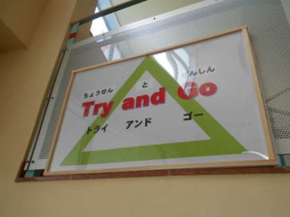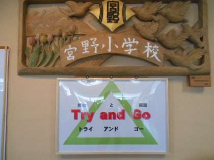 宮野っ子の合い言葉「Try and Go」が木枠に入り、デラックスになりました。用務員の方がつくってくださいました。