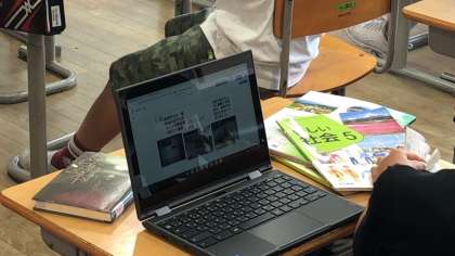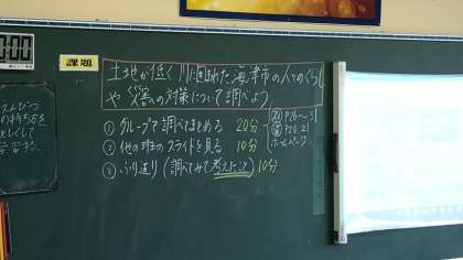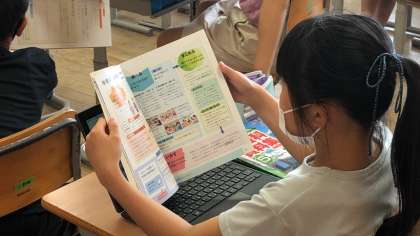 社会科の学習では、教科書から読み取ったことを友達と協力してスライドにまとめています。活動を通して気付いたことをみんなで共有しました。