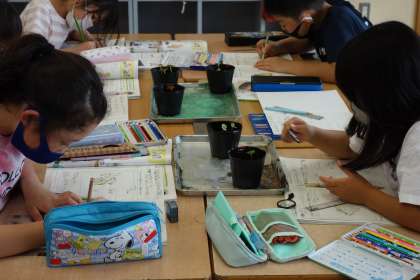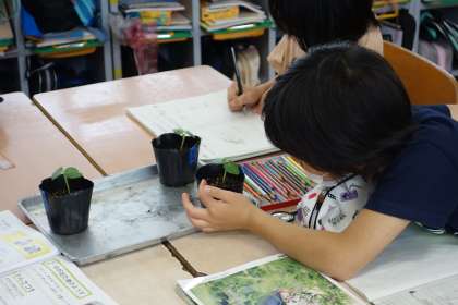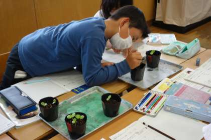 今日は、出てきた芽の観察を行いました。2枚の子葉から別の葉が出てきていることに気付きました。