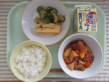 今日の献立は、ごはん、えごま入り卵焼き、華風和え、酢豚、牛乳です。