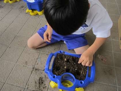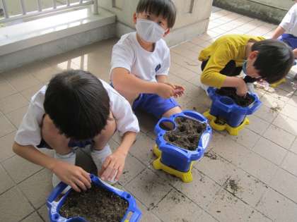 生活科の学習で、あさがおを育てます。一人一つ鉢をもらい、土に肥料をまぜ、たねをまきました。たねをそっと穴に入れたり、土を優しくかぶせてあげたりする姿が見られました。大切に育てようという気持ちが伝わってきました。