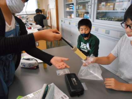 今日は、人が空気を吸ったとき酸素の一部を取り込んで二酸化炭素をはき出していることを実験で確かめました。